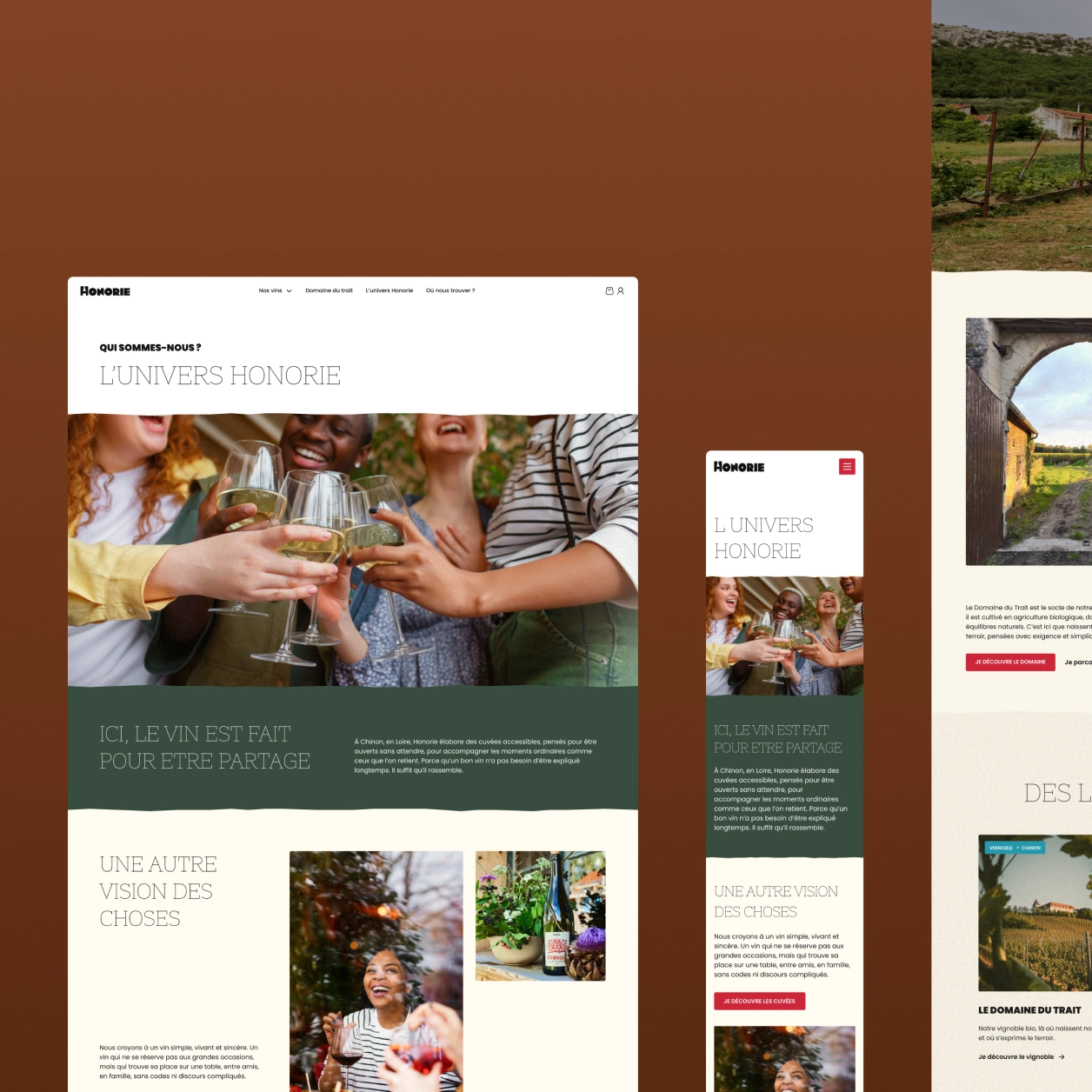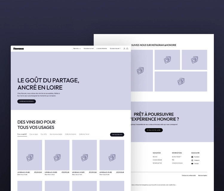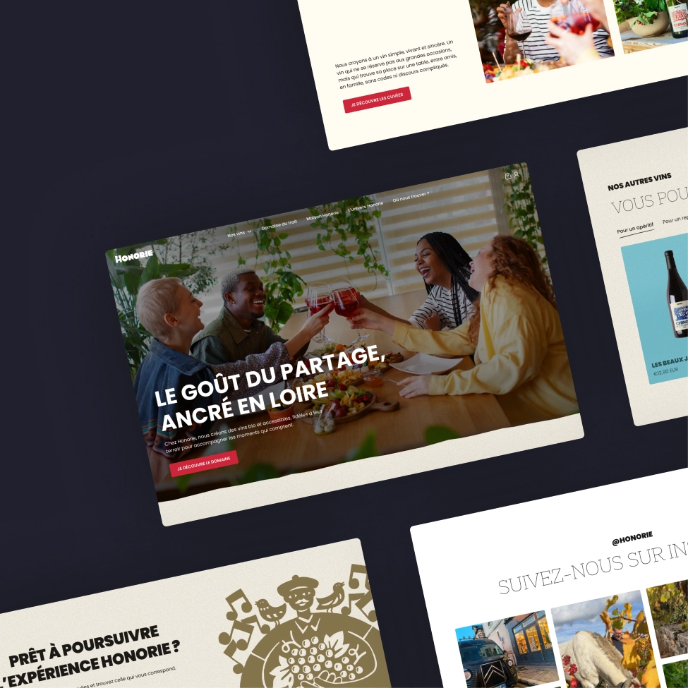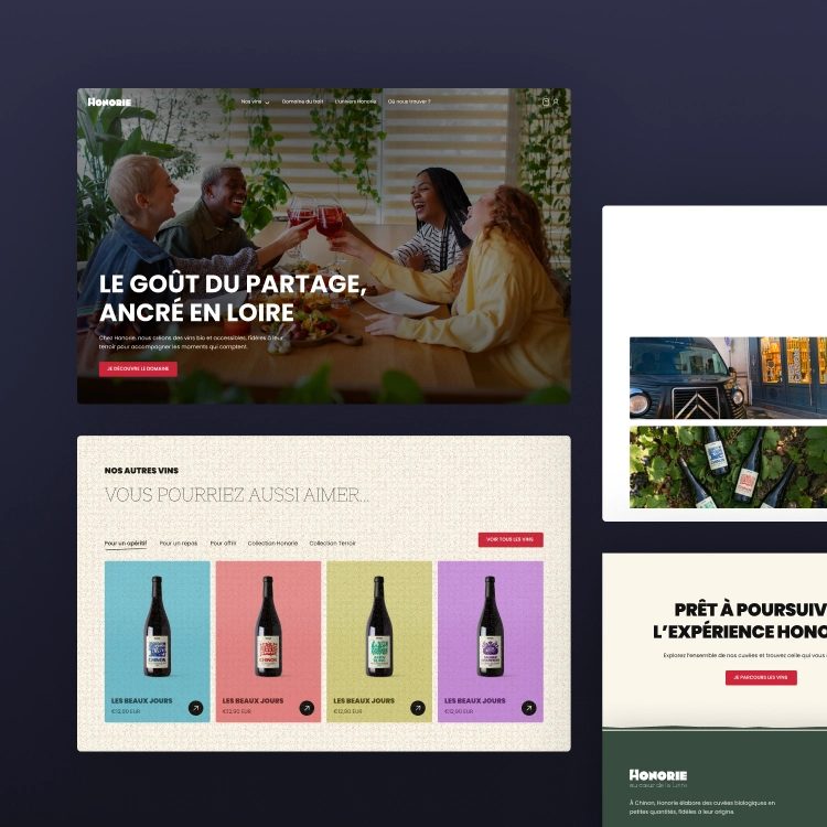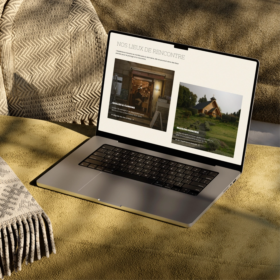 Entre vignoble, gîte et bar, il manquait à Honorie un espace où découvrir l’ensemble de leur écosystème. Notre mission était de concevoir une expérience e-commerce simple et efficace, tout en racontant l’histoire et les lieux qui composent Honorie.