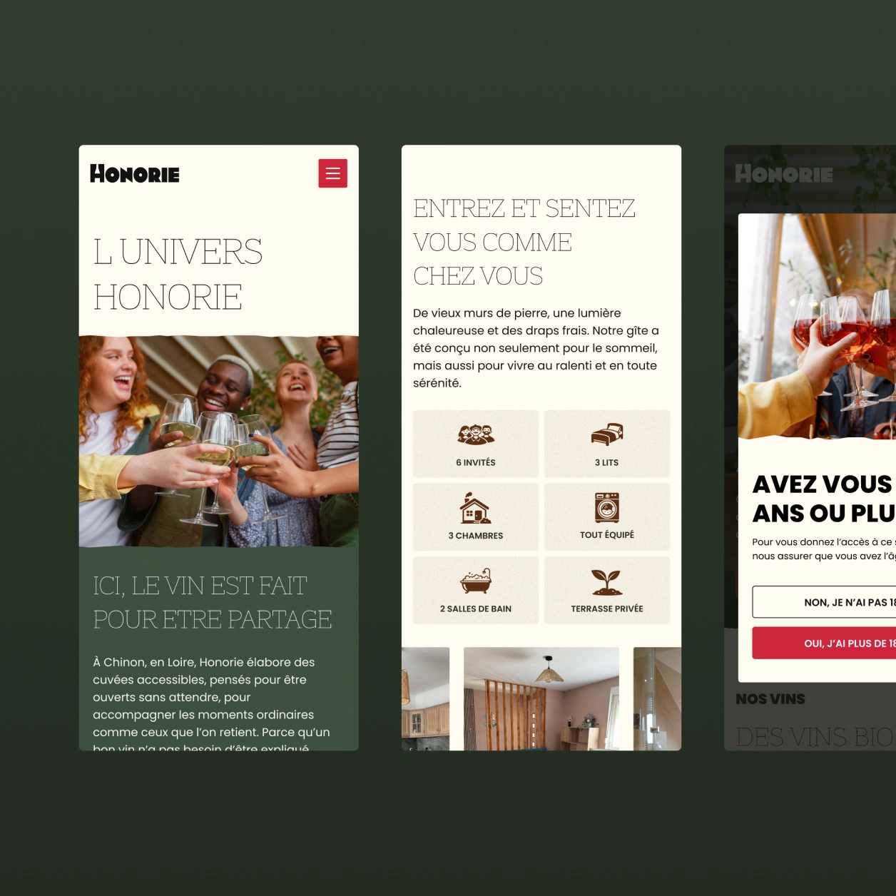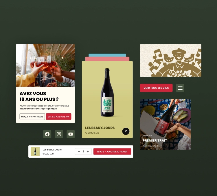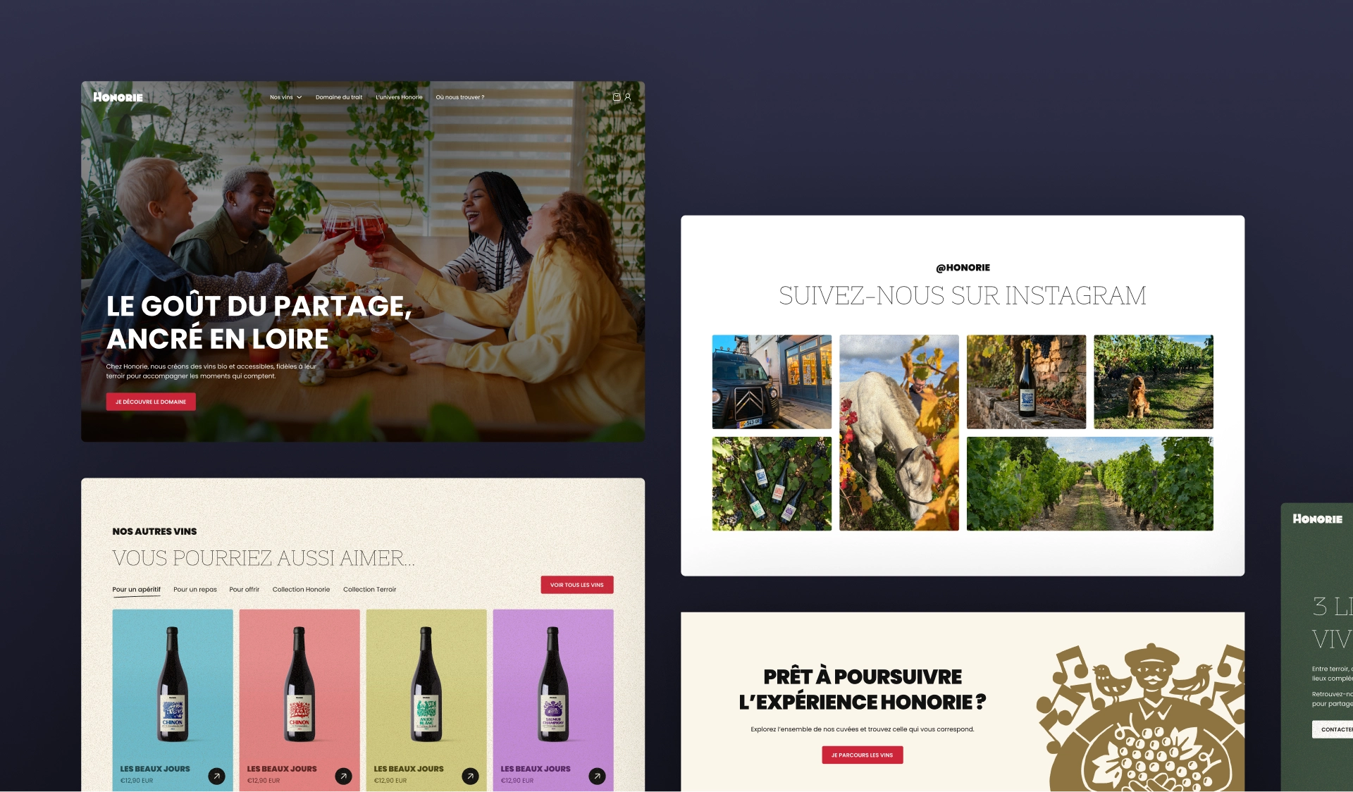 Entre vignoble, gîte et bar, il manquait à Honorie un espace où découvrir l’ensemble de leur écosystème. Notre mission était de concevoir une expérience e-commerce simple et efficace, tout en racontant l’histoire et les lieux qui composent Honorie.
